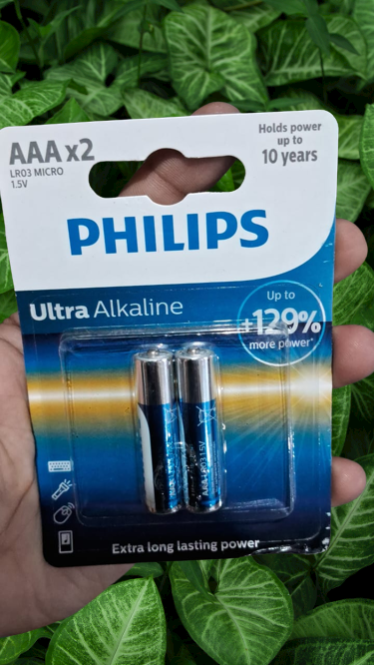 Philips AAA x2 Pencil Battery 2 Pcs is a pack of two AAA-sized alkaline batteries manufactured by Philips. These batteries are commonly used in various electronic devices such as remote controls, toys, and small gadgets. They provide reliable power for everyday use and are designed to deliver long-lasting performance. The "pencil battery" designation is a colloquial term for cylindrical batteries, and the AAA size indicates their specific dimensions.