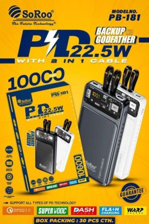 The SoRoo PB-181 10,000mAh Powerbank is a high-capacity and fast-charging portable solution for keeping your devices powered on the go. With a 22.5W output, it ensures swift and efficient charging for various devices. The compact design makes it easy to carry, fitting comfortably in your pocket or bag. Equipped with advanced charging technology, the SoRoo PB-181 is a reliable companion for those who require a powerful and fast-charging powerbank to stay connected throughout their day. Stay charged and connected with the SoRoo PB-181 wherever your adventures take you.